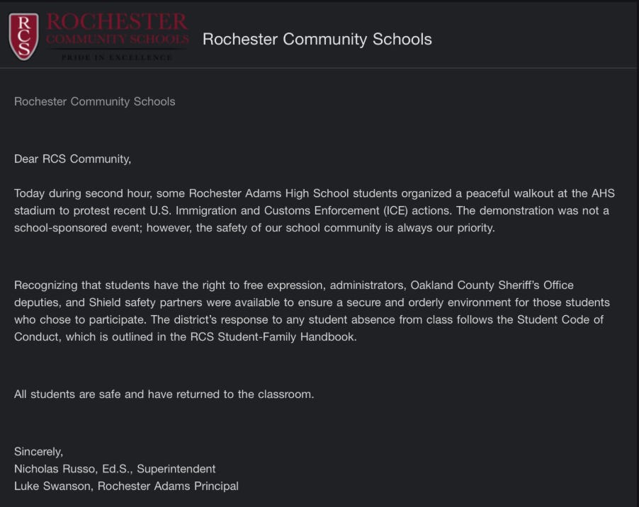 “Today during second hour, some Rochester Adams High School students organized a peaceful walkout at the AHS stadium to protest recent U.S. Immigration and Customs Enforcement actions,” the district said in a statement sent to families. “The demonstration was not a school-sponsored event; however, the safety of our school community is always our priority.”