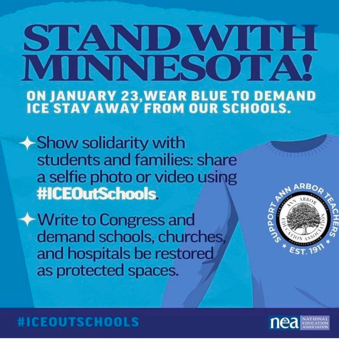 National teachers unions have also weighed in. The National Education Association, the country’s largest teachers union, has publicly encouraged members to oppose ICE enforcement, framing immigration policy as a civil rights issue and calling on educators to participate in protests and advocacy efforts. The poster below was distributed by the Ann Arbor teachers union.