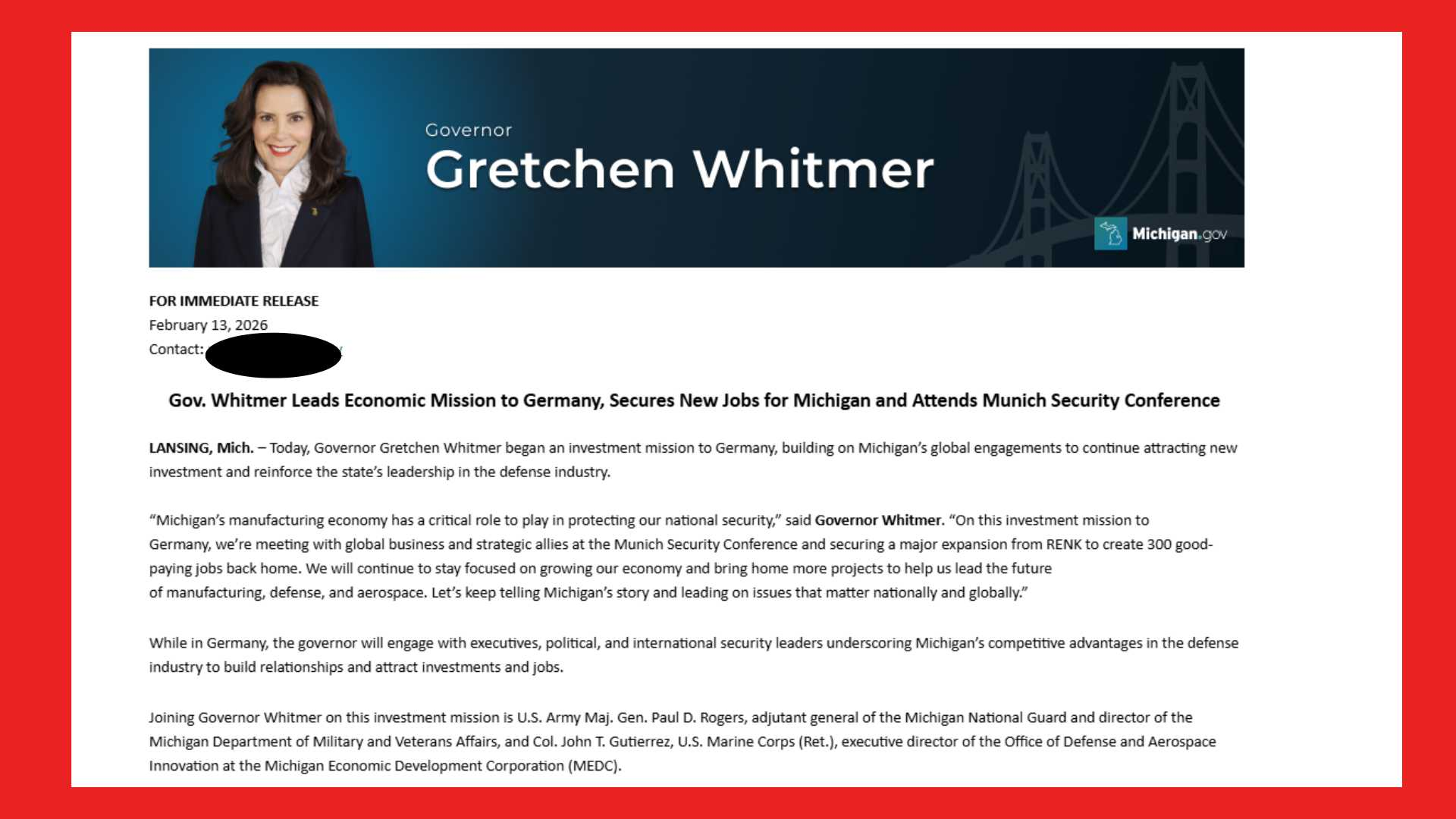 Gov. Whitmer is on the road again. She just sent out this news release saying she will be headed to Germany.