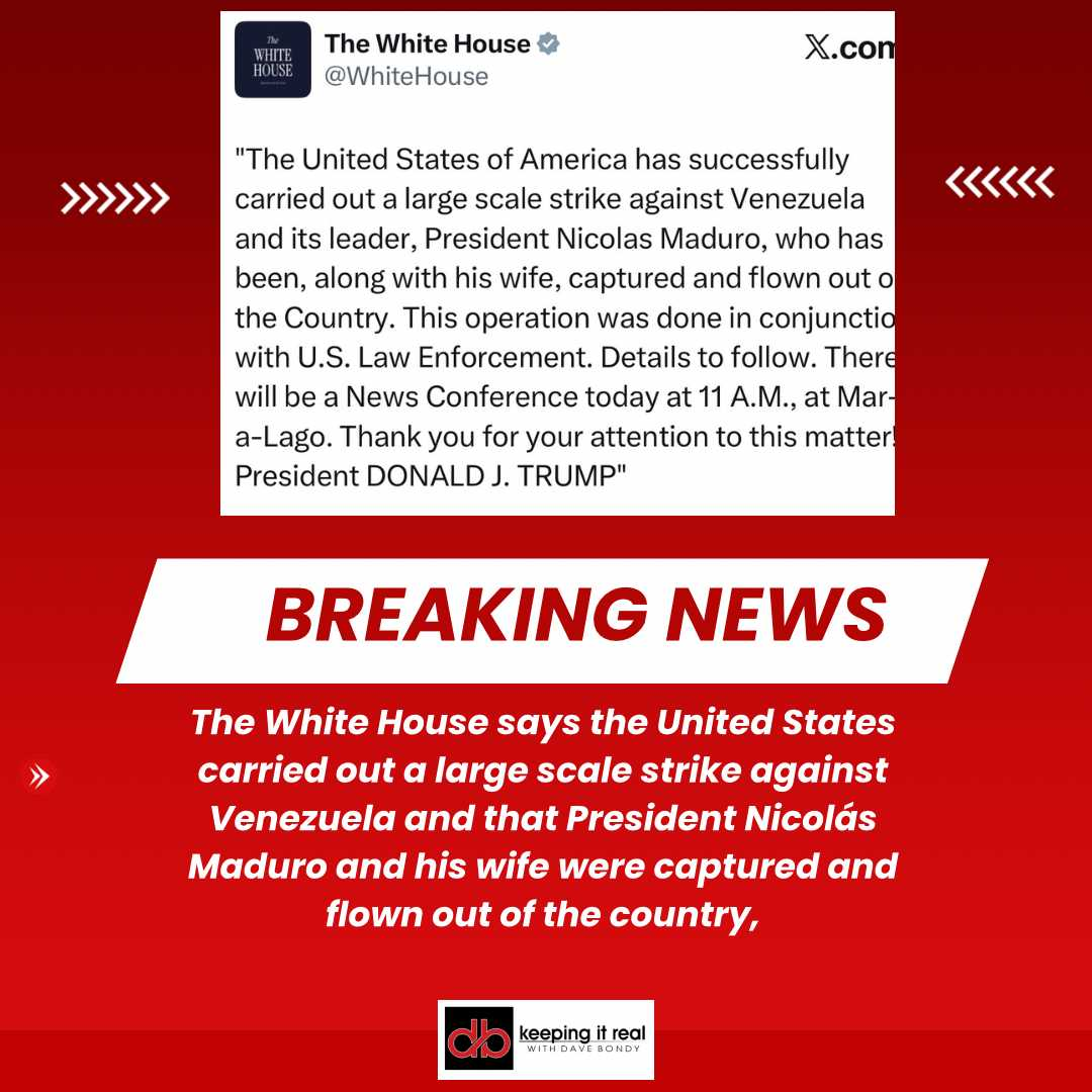 The White House says the United States carried out a large scale strike against Venezuela and that President Nicolás Maduro and his wife were captured and flown out of the country, with more details promised later.